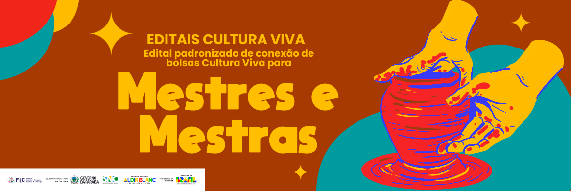 O Governo do Estado da Paraíba, por meio da Secretaria de Estado da Cultura, torna público o presente Edital para concessão de Bolsa Cultura Viva a Mestras e Mestres das Culturas Tradicionais e Populares, destinadas à implementação da Política Nacional de Cultura Viva (PNCV), instituída pela Lei nº 13.018, de 22 de julho de 2014, para valorização, fortalecimento e transmissão dos conhecimentos tradicionais e populares. O presente edital é regido pelo disposto na Lei nº 14.399, de 08 de julho de 2022 (Lei da Política Nacional Aldir Blanc de Fomento à Cultura), no Decreto nº 11.740, de 18 de outubro de 2023, e Portaria MinC nº 80, de 27 de outubro de 2023 (Regulamentam a Aldir Blanc), na Portaria MinC nº 206, de 13 de maio de 2025 (Aplicação dos recursos destinados à PNCV), na Instrução Normativa MINC nº 10, de 28 de dezembro de 2023 (Política Nacional Aldir Blanc de Ações Afirmativas e Acessibilidade), na Lei nº 14.903, de 27 de junho de 2024 (Marco regulatório do fomento à cultura), no Decreto nº 11.453, de 23 de março de 2023 (Decreto de Fomento), na Lei nº 13.018, de 22 de julho de 2014 (Política Nacional de Cultura Viva), na Instrução Normativa MINC nº 08, de 11 de maio de 2016, e na Instrução Normativa MINC nº 12, de 28 de maio de 2024 (regulamentam a PNCV). Este Edital é realizado com recursos do Governo Federal repassados pelo Ministério da Cultura, por meio da Política Nacional Aldir Blanc de Fomento à Cultura. Aqui você vai encontrar as regras deste edital e como fazer para se inscrever. Estamos muito felizes com seu interesse em participar desta política. Boa leitura.